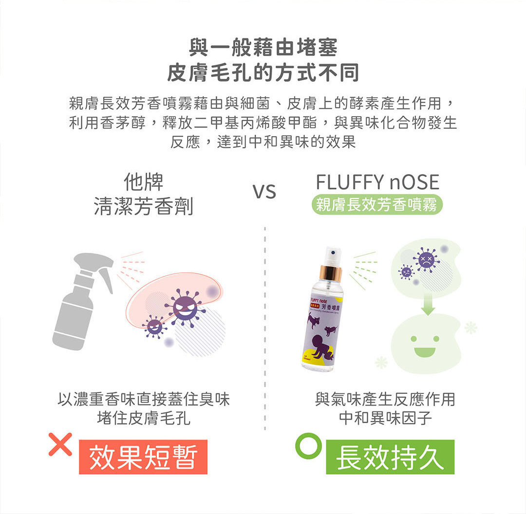 除了著重毛孩的需求,毛鼻子專門為飼主量身打造溫和又智能的親膚長效芳香噴霧,讓飼主可以輕鬆的調理自身、周遭環境以及毛孩的氣味問題。